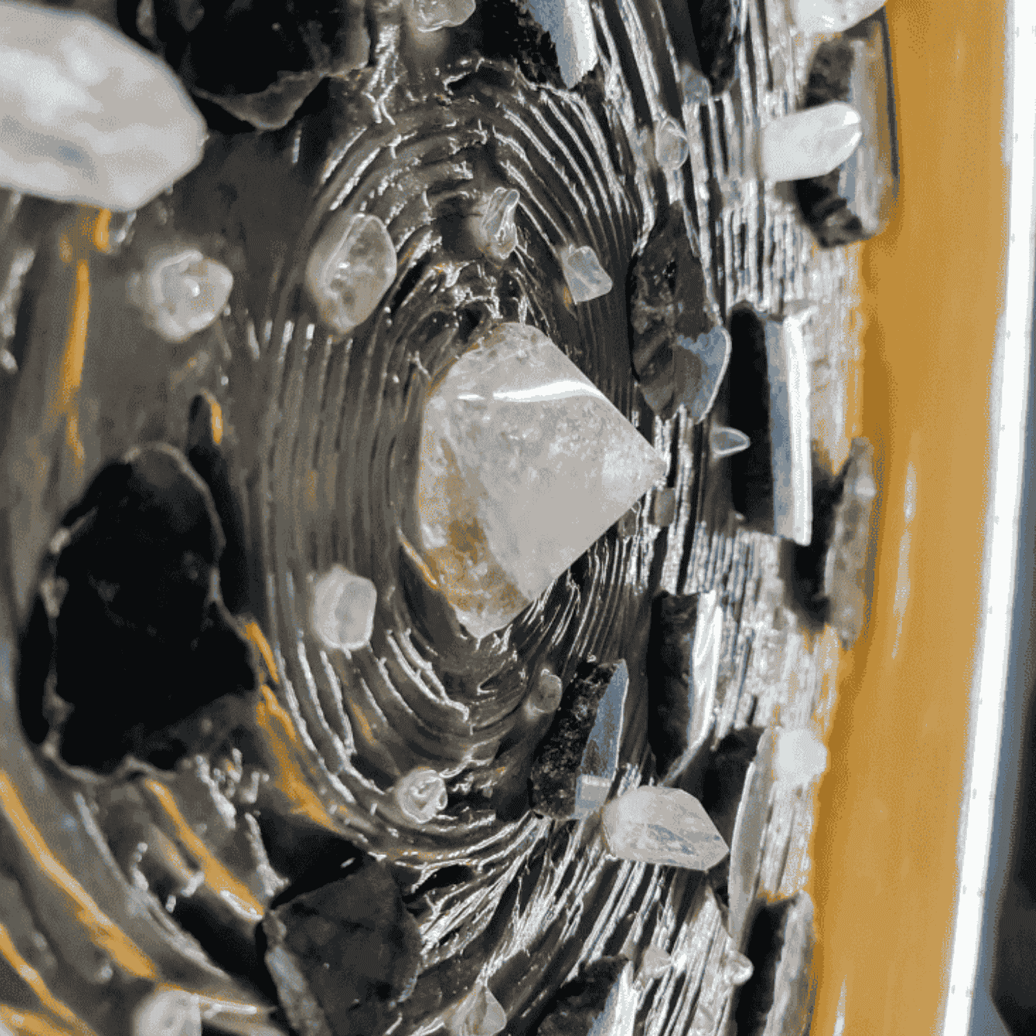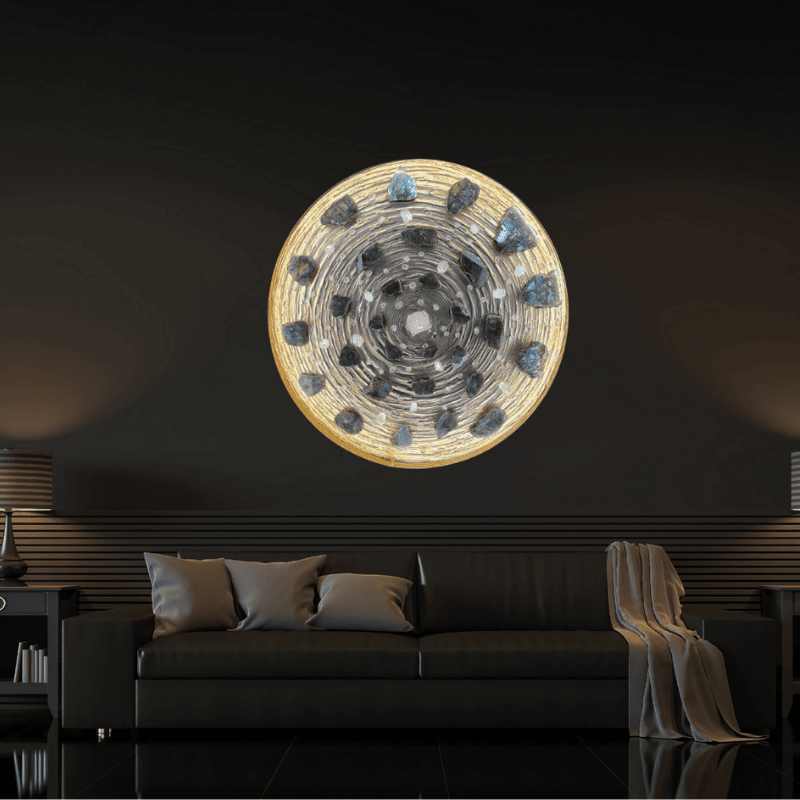 Stell dir vor, Milliarden Jahre alte Energie erwacht in deinem Wohnraum zum Leben. Unser Erstlingswerk (Unikat 001) ist keine bloße Leuchte – es ist eine Symbiose aus mystischem Labradorit und klarem Bergkristall, eingefasst in handgefertigte Präzisionsrahmen. Mit einer Präsenz von 80 cm Durchmesser beansprucht dieses Unikat den Raum für sich und transformiert ihn in eine Galerie der Naturkraft. Durch die fein justierbare Lichtsteuerung bestimmst du, wann die verborgenen Farben der Steine tanzen.